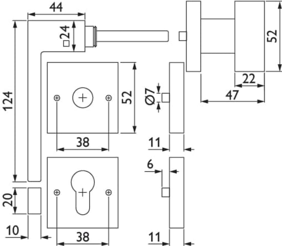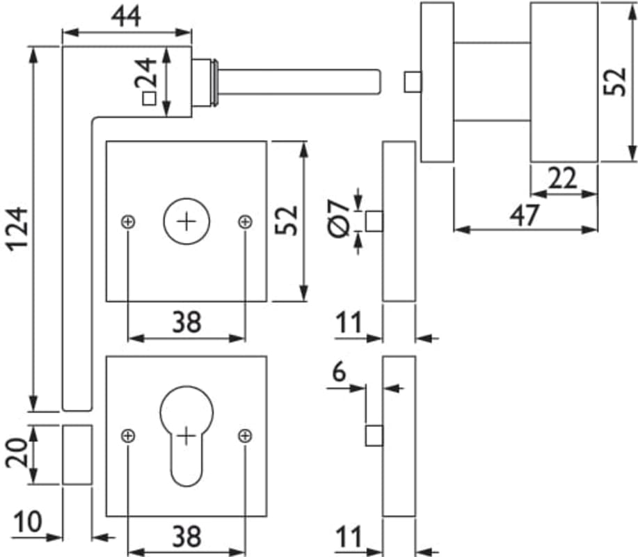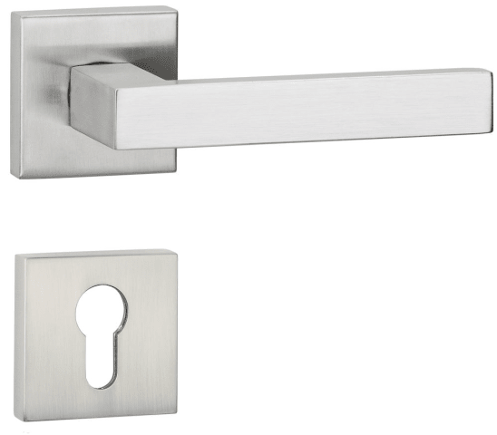 ZT-Wechselgarnitur 1682 L WEST, mit Rosetten 2011 KD & RHF / Knopf 3127 K (kantig), Ausf.: PZW, links/rechts verwendbar, mit Rückholfeder, Türstärke 38 - 42 mm, Oberfl. 60 (Edelstahl matt)