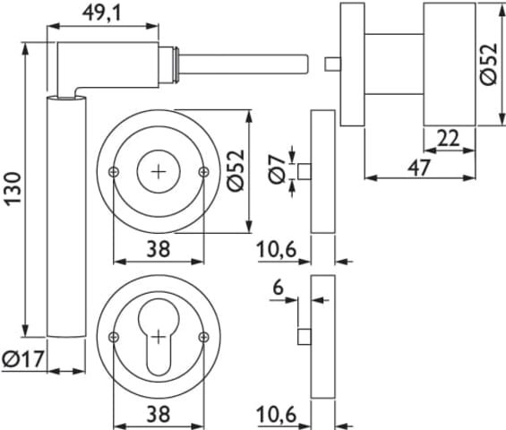 ZT-Wechselgarnitur 1124 M MIND, mit Rosetten 2031 / Knopf 3127, Ausf.: PZW, DIN rechts, mit Rückholfeder, Türstärke 38 - 42 mm, Oberfl. 11 (Glanzchrom/Mattnickel)