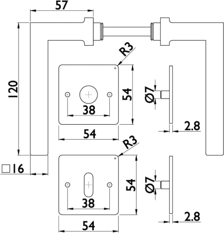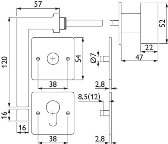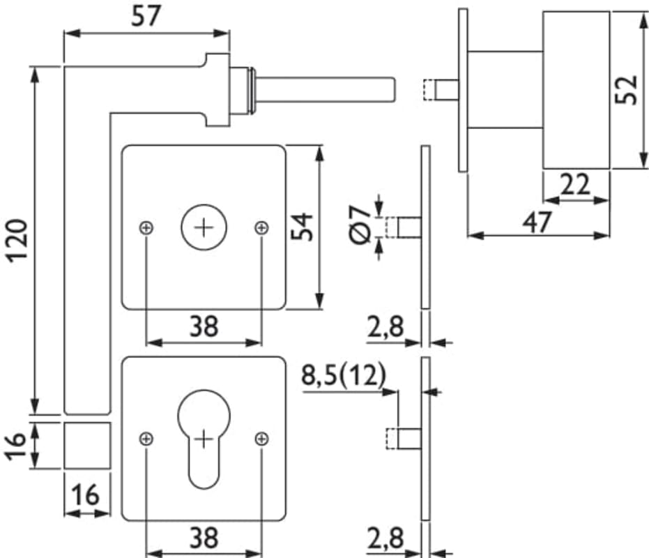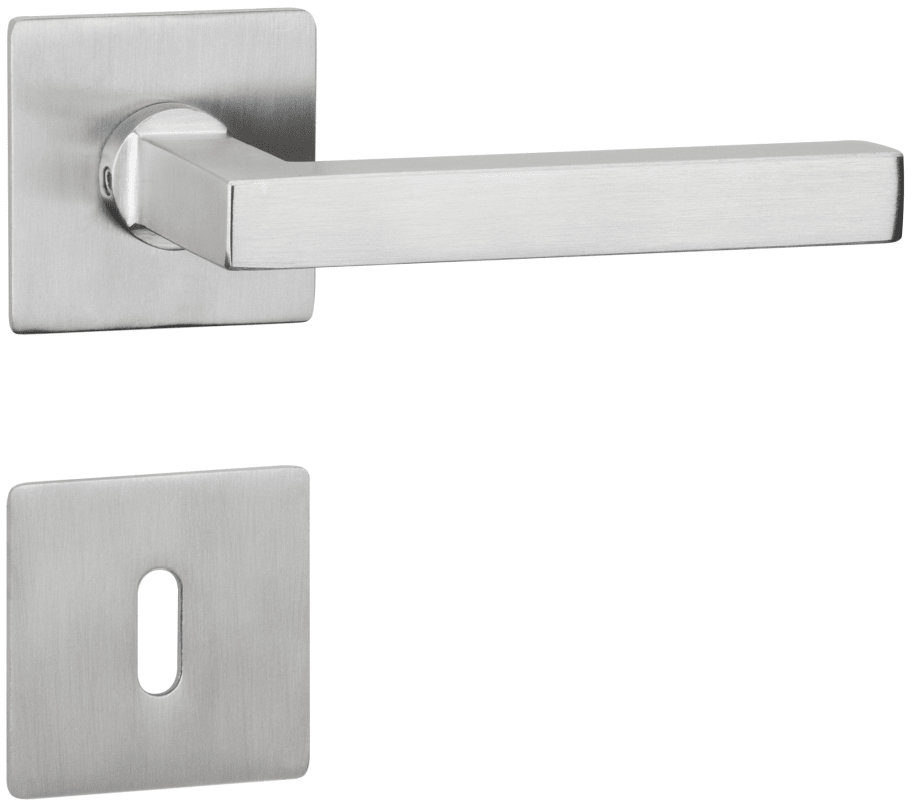 ZT-Wechselgarnitur 1835 SQUARE, mit MAGCLIP Rosetten 2611 FL & RHF / Knopf 3127 K, Ausf.: PZW DIN links, fest/drehbar, mit Rückholfeder, Tst. 38 - 45 mm, Oberfl. 60 (Edelstahlfarben matt)