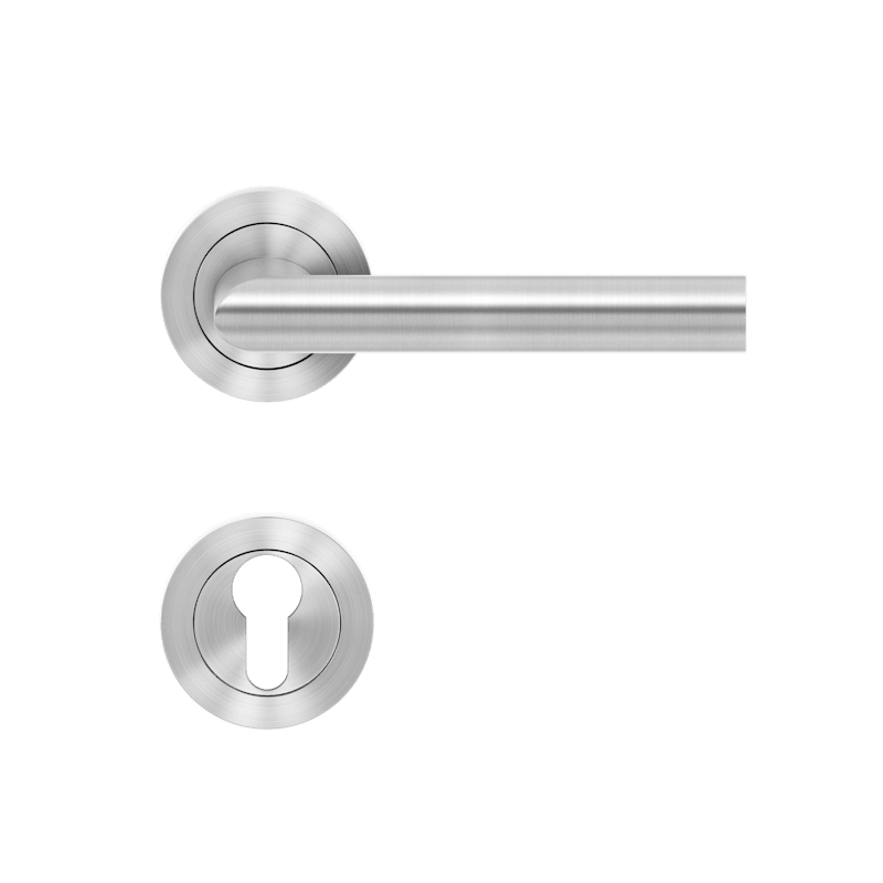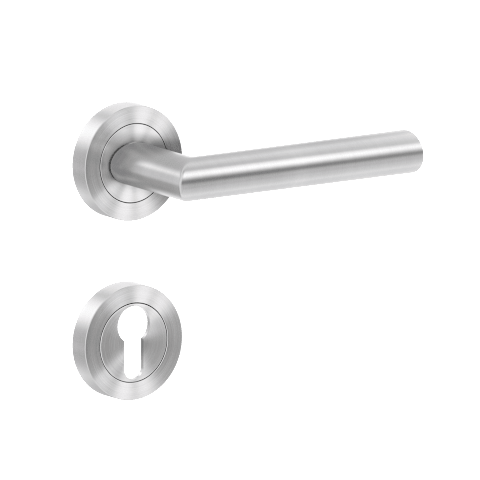 Drückergarnitur mit Türdrückermodell ER37 Verona Steel, für Standardtüren nach DIN EN 1906, Benutzungskategorie 3. Eigenschaften: • 3-teiliger Schraubrosette kantig • Gleitlager aus Nylon • fest dreh