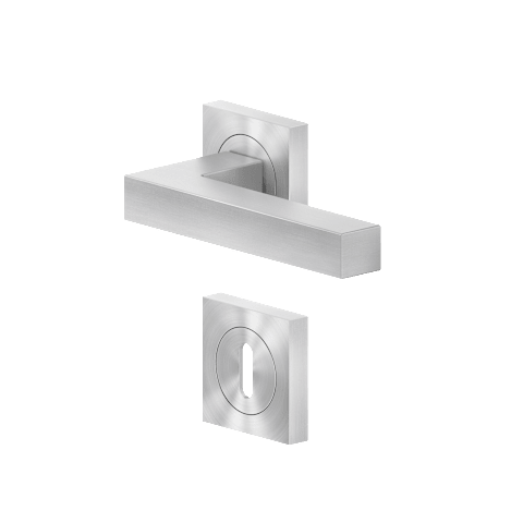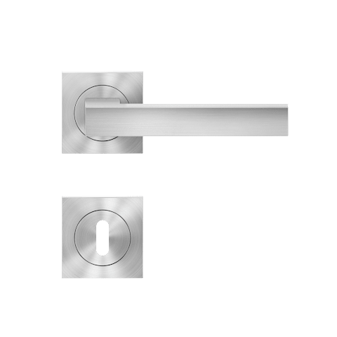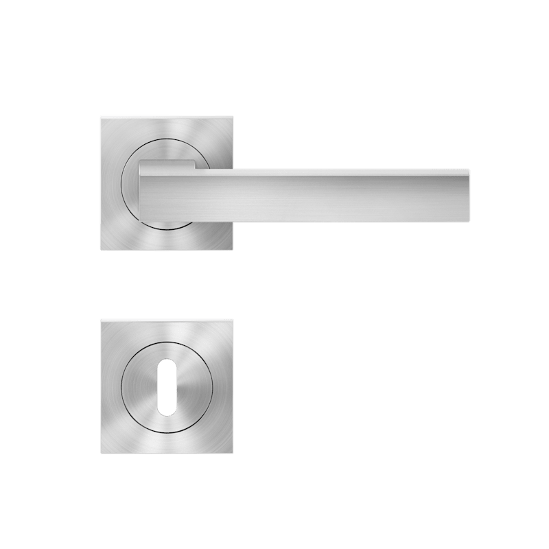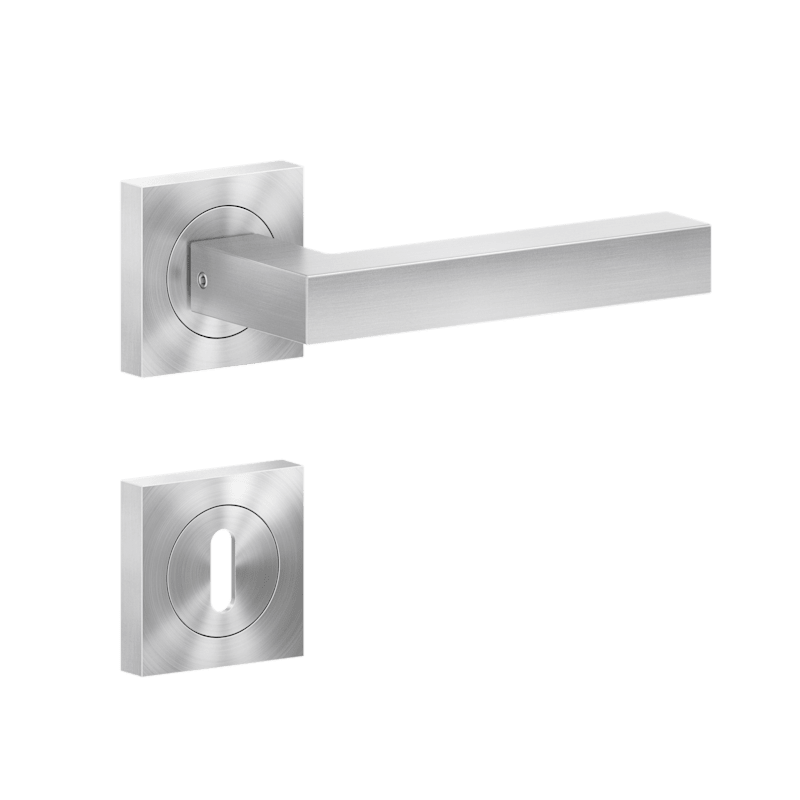Drückergarnitur mit Türdrückermodell ER46Q Seattle, für Standardtüren nach DIN EN 1906, Gebrauchskategorie 3. Eigenschaften: • 3-teiliger Schraubrosette quadratisch • Gleitlager aus Nylon • fest dreh