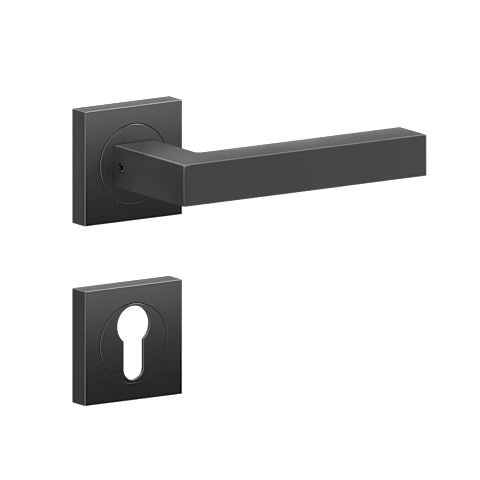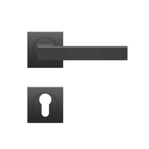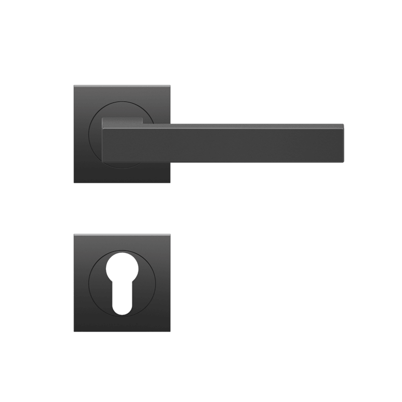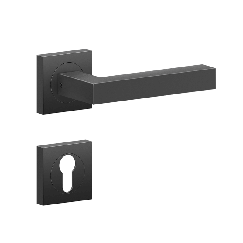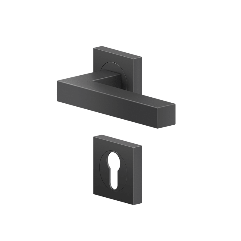 Drückergarnitur mit Türdrückermodell ER46Q Seattle, für Standardtüren nach DIN EN 1906, Gebrauchskategorie 3. Eigenschaften: • 3-teiliger Schraubrosette quadratisch • Gleitlager aus Nylon • fest drehb