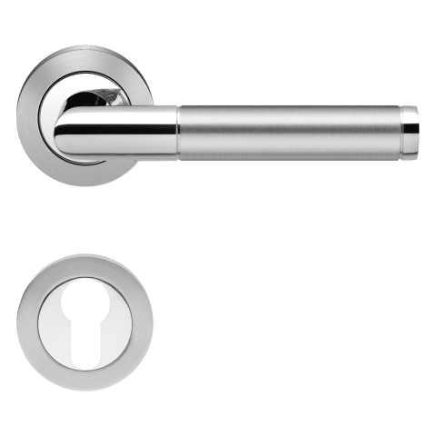 Drückergarnitur mit Türdrückermodell ER34 Rio Steel, für Standardtüren nach DIN EN 1906, Gebrauchskategorie 3. Eigenschaften: • 3-teiliger Schraubrosetten kantig • fest drehbar gelagert mit Hochhal