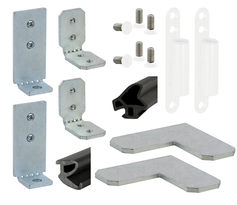 Zubehörset für 1 flg. Zargen 6961 - Glasmontage, 2x Eckwinkel, 2x Montagewinkel für Gehrung, 2x Rahmenteile mit Befestigungsschrauben, für Trennwandglasstärke 10 - 10,76 mm, Dichtungen schwarz, Rahmenteile und Schrauben weiß