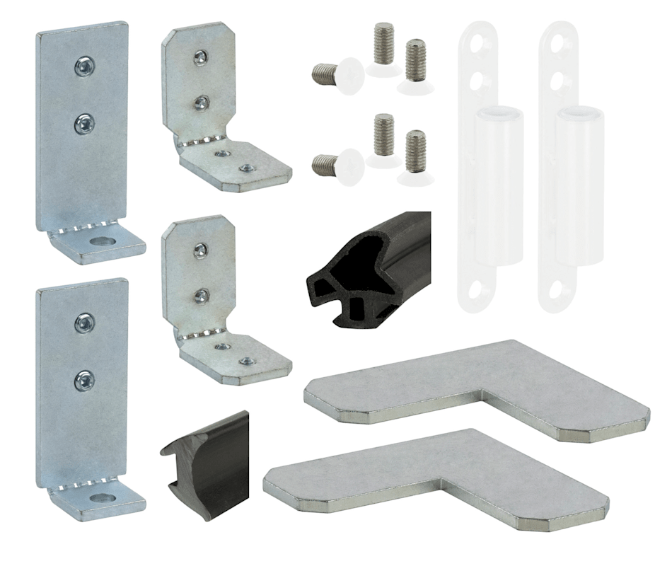 Zubehörset für 1 flg. Zargen 6961 - Glasmontage, 2x Eckwinkel, 2x Montagewinkel für Gehrung, 2x Rahmenteile mit Befestigungsschrauben, für Trennwandglasstärke 12 - 12,76 mm, Dichtung schwarz, Rahmente