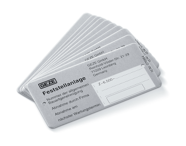 für GEZE Feststellanlagen. bestehend aus: 10 Stück Zulassungsschildern. 10 Stück Terminaufklebern.