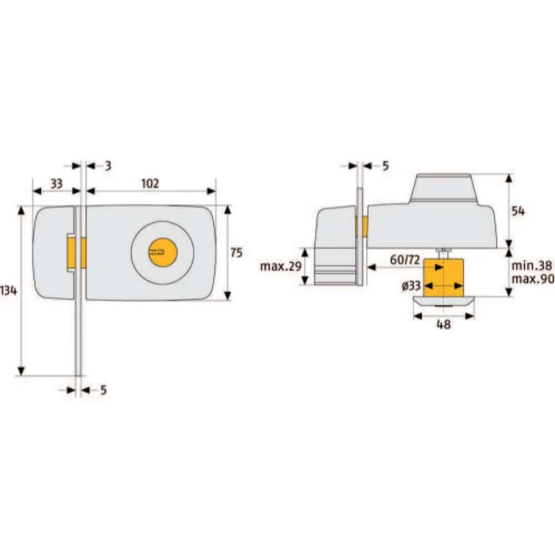 Technik und Ausstattung: Druckwiderstand über 1 Tonne. Zwei Dornmaße einstellbar: 60 und 72 mm.Stabiler Ovalriegel aus Vollstahl, zweitourig schließend. Gehärteter Sperrbügel für die spaltbreite Türöffnung. Mit Innen- und Außenzylinder Serie EC550, inkl. drei Schlüssel.