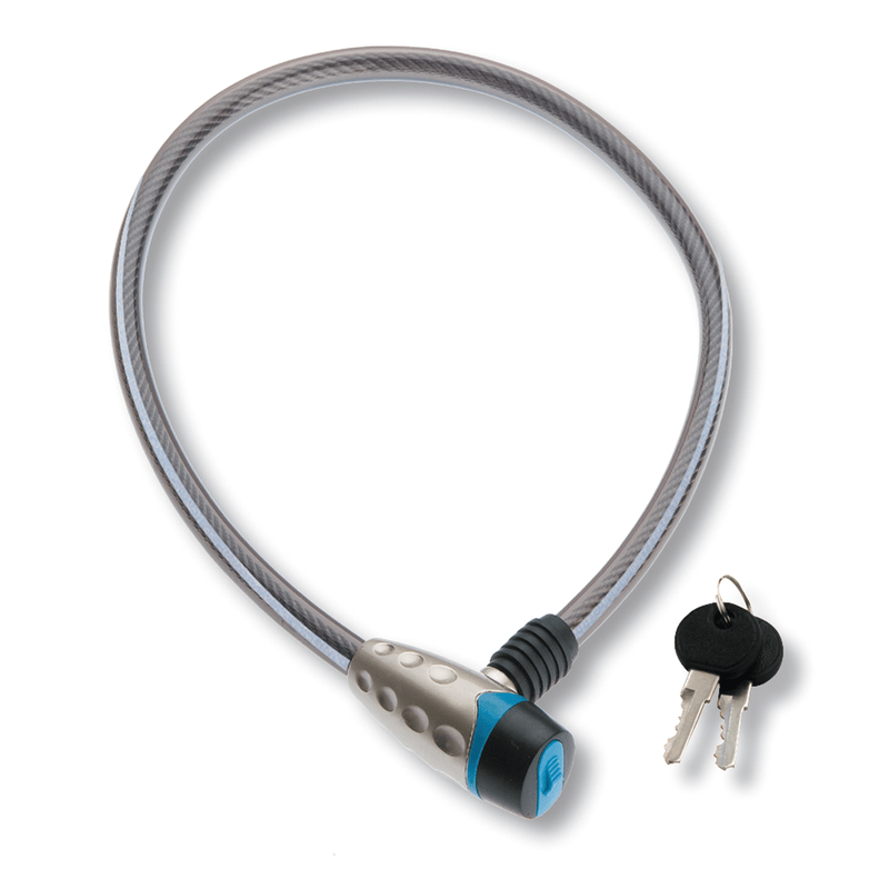 Kräftiges Seilschloss mit Stiftzylinder und mit Schlüssellochverdeckung. Seil mit Reflektionsstreifen.