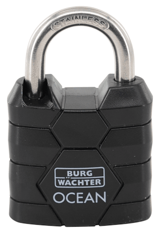 Das Vorhangschloss Ocean 490 Ni 30 mit einem Korpus aus massivem Messing und einem stoß-, schlag- und kratzfesten Mantel aus 70% recyceltem Kunststoff bietet optimale Sicherheit für Türen, Tore und al