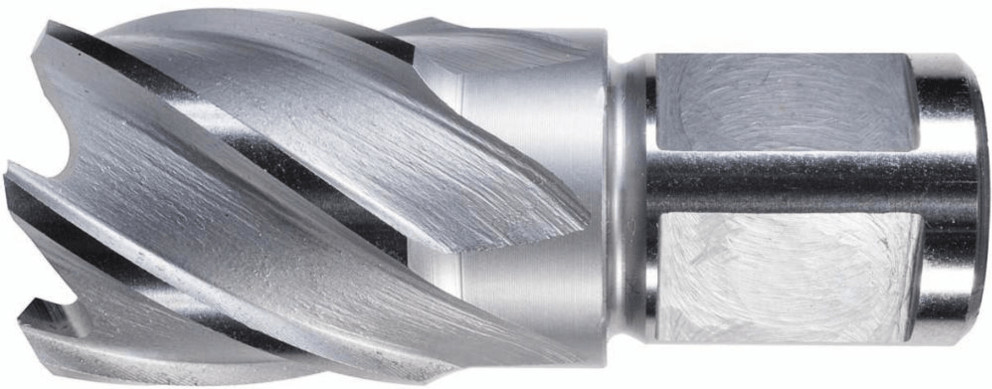 Kernbohrer, blank• HSS • Mit 19 mm Weldonschaft, 2 Mitnahmeflächen • Innenbohrung 6,35 mm • Kernbohrer zerspant nur einen dünnen Materialring • Ausstoßen des stehengebliebenen Bohrkerns über Führu