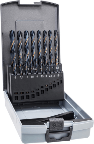 Spiralbohrer-Satz, dampfbehandelt• HSS • Präzisionsrollgewalzt, Führungsfasen geschliffen • DIN 338 • Typ N • Spitzenwinkel 118° • Spiralwinkel 25-30° • Seitenspanwinkel normal • Kernanstieg no