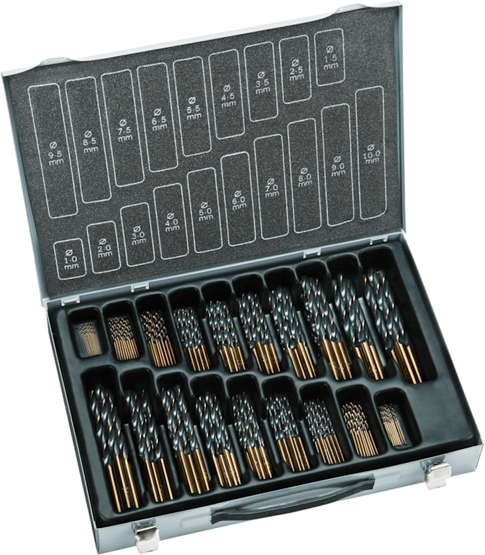 Spiralbohrer-Satz, dampfbehandelt• HSS • Präzisionsrollgewalzt, Führungsfasen geschliffen • DIN 338 • Typ N • Spitzenwinkel 118° • Spiralwinkel 25-30° • Seitenspanwinkel normal • Kernanstieg no