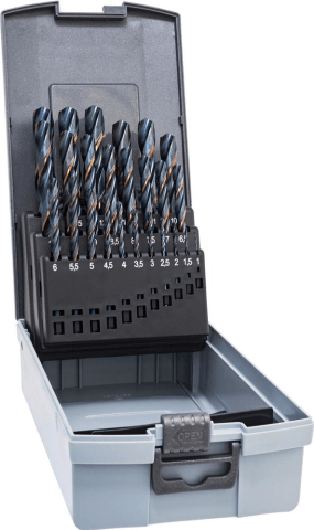 Spiralbohrer-Satz, dampfbehandelt• HSS • Präzisionsrollgewalzt, Führungsfasen geschliffen • DIN 338 • Typ N • Spitzenwinkel 118° • Spiralwinkel 25-30° • Seitenspanwinkel normal • Kernanstieg no