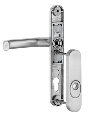 Schutz-Kombi-Drückergarnitur Kronos 1207/7253, Langschild/Rosette, 10mm, ES 1, mit Zylinderabdeckung, Profilzylinder gelocht, Entfernung 92mm, Vierkant 8mm, TS 73 - 77mm, silber, naturfarben, eloxiert