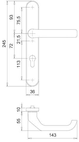 Drückergarnitur Kronos 1200/0635, Langschild oval, Profilzylinder gelocht, Entfernung 72mm, Vierkant 8, DIN Links-Rechts, mit Stütznocken, naturfarben eloxiert, festdrehbar