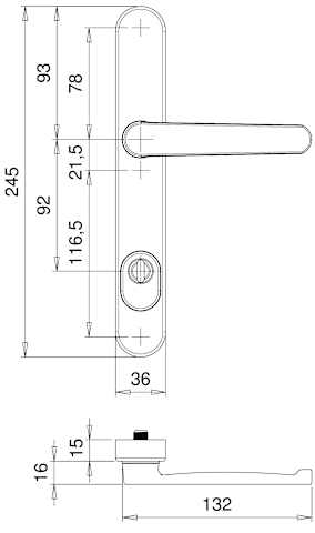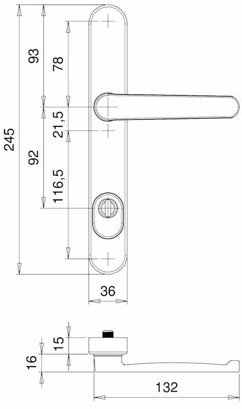 Rohrrahmen Sicherheits-Drückergarnitur Kronos 1207/9045,Langschild,mit Zylinderabdeckung 92/8,DIN Links-Rechts,naturfarben eloxiert,gerade/U-Form gekröpft