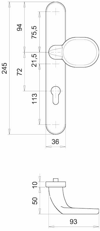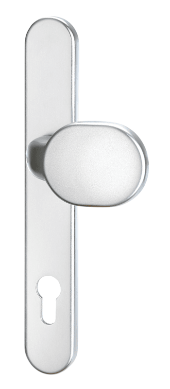 Wechselgarnitur Kronos 1200/2635, Langschild oval, Profilzylinder gelocht, Entfernung 72mm, Vierkant 8, DIN Links-Rechts, mit Stütznocken, naturfarben eloxiert, festdrehbar