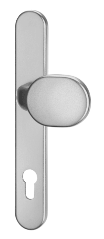 Wechselgarnitur Kronos 1200/2635, Langschild oval, Profilzylinder gelocht, Entfernung 72mm, Vierkant 8, DIN Links-Rechts, mit Stütznocken, stahlfarbig eloxiert, festdrehbar