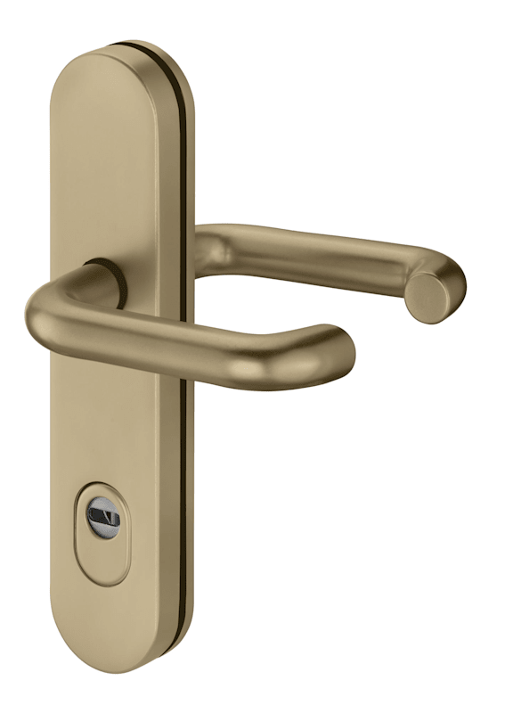 Vollblatt Sicherheits-Drückergarnitur Logo 8755/9203,Langschild,ES 1,mit Zylinderabdeckung 92/10,DIN Links-Rechts,bronzefarben eloxiert,Türstärke65-75,U-Form/U-Form