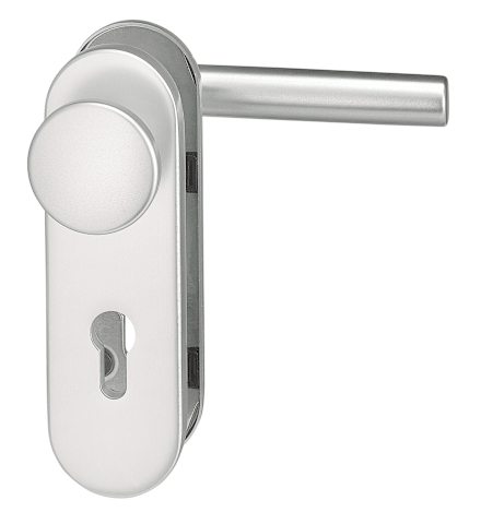 Vollblatt Sicherheits-Wechselgarnitur Logo 8793/0772,Kurzschild,ohne Zylinderabdeckung 72/8,DIN Links-Rechts,naturfarben eloxiert,Türstärke35-45,rund/Gehrung fest