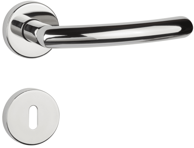 Bad-Drückergarnitur 1804 BASIC 04, mit Rosetten 2036 KB, Ausf.: BAD mit Riegel 3212/3216 - 6 mm Vierkant, mit Hülse 7/8 mm, Türstärke 38 - 42 mm, Oberfl. 61 (Edelstahl poliert)
