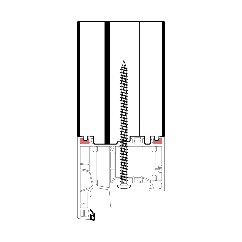 Die konturangepasste Aufnahme gewährleistet eine schnelle und einfache Montage des Profils mit der blaugelb Rahmenfixschraube FK-T30 und eine exakte Positionierung durch die Konturfräsung. Somit entsteht keine Hohlkammer zwischen Bankanschlussprofil und Blendrahmen und durch die prozesssichere Abdichtung wird Luftdichtheit erreicht.