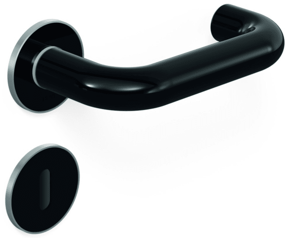 Türdrücker Modell 111.23PC in U-Form aus Polyamid hochglänzend, mit durchgehendem Stahlkern bis in das Drückerende, durchgängig eingefärbt, Durchmesser 23 mm, mit Ansatzführung und Gewindestift M5 als zusätzliche Fixierung der Türdrücker mit dem Vierkantstift zur optimalen Kraftübertragung in das Türblatt. Der Drücker erfüllt die Vorgaben der DIN 18040.