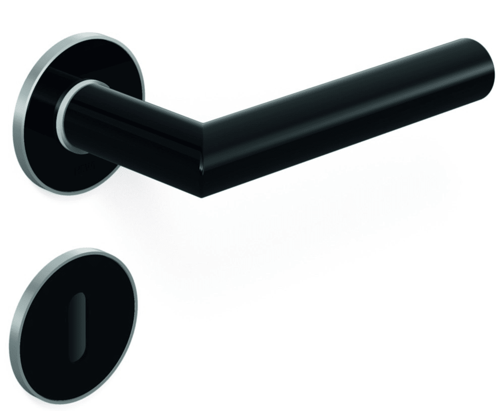 Zimmergarnitur mit Schlüsselrosetten mit flachen Rosetten nach DIN 18255 und DIN EN 1906 und Inlay aus farbigem Polyamid, bestehend aus: Türdrücker Modell 162.21PC in Gehrungsform aus Polyamid hochgl