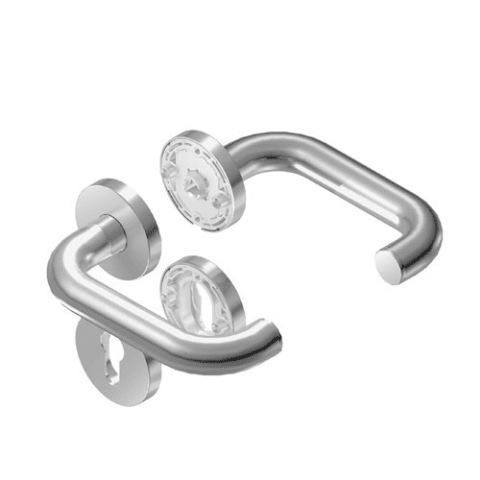 BKS Drückergarnitur RONDO B-70000; Abdeckung: mit Rosetten; Form: rund; Vierkant: 8 mm; Material: Aluminium; Befestigungsart: verdeckt verschraubt; Befestigungstechnik: mit Stütznocken; Benutzerklasse
