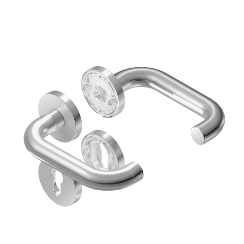 BKS Drückergarnitur RONDO B-70000; Abdeckung: mit Rosetten; Form: rund; Vierkant: 8 mm; Material: Edelstahl; Befestigungsart: verdeckt verschraubt; Befestigungstechnik: mit Stütznocken; Benutzerklasse: Klasse 4; Basis: Drückergarnitur; Ausführung: mit Drücker H1.0; Lochung: ohne Lochung; Farbton: edelstahl; Oberfläche: matt gebürstet; Anschlagrichtung: Drücker rechts/links verwendbar; Türstärke min.: 37 mm; Türstärke max.: 42 mm; Stärke Abdeckung: 9 mm; Durchmesser: 55 mm; Lagerung: festdrehbar,wartungsfrei; Norm: DIN EN 1906; Drückerform: U-Form; Drückerdurchmesser: 21 mm; Drückerhöhe: 70 mm; Drückerlänge: 145 mm; Drückerbefestigung: Vierkantstift; Befestigungssystem: Stiftverbindung; Türart: Abschlusstüren; Türwerkstoff: Holz,Stahl; Einsatzbereich: Objekttür; DIN-Richtung: DIN Links-Rechts