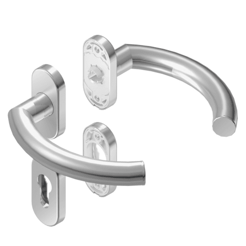 BKS Drückergarnitur OFFICE B-70030; Abdeckung: mit Rosetten; Form: oval; Vierkant: 8 mm; Material: Edelstahl; Befestigungsart: verdeckt verschraubt; Befestigungstechnik: ohne Stütznocken; Benutzerklas