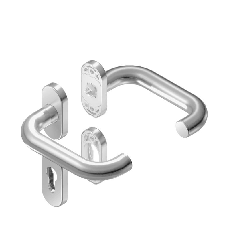 BKS Drückergarnitur RONDO B-70030; Abdeckung: mit Rosetten; Form: oval; Vierkant: 8 mm; Material: Edelstahl; Befestigungsart: verdeckt verschraubt; Befestigungstechnik: ohne Stütznocken; Benutzerklasse: Klasse 4; Basis: Drückergarnitur; Ausführung: mit Drücker H1.0; Lochung: Schweizer Rundzylinder gelocht; Farbton: edelstahl; Oberfläche: matt gebürstet; Anschlagrichtung: Drücker rechts/links verwendbar; Türstärke min.: 65 mm; Türstärke max.: 80 mm; Stärke Abdeckung: 9 mm; Länge: 70 mm; Breite: 32,7 mm; Lagerung: festdrehbar,wartungsfrei; Norm: DIN EN 1906; Drückerform: U-Form; Drückerdurchmesser: 21 mm; Drückerhöhe: 70 mm; Drückerlänge: 145 mm; Drückerbefestigung: Vierkantstift; Befestigungssystem: Stiftverbindung; Türart: Rahmentüren; Türwerkstoff: Aluminium,Stahl; Einsatzbereich: Objekttür; DIN-Richtung: DIN Links-Rechts