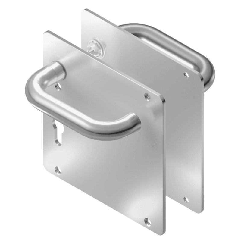 BKS Drückergarnitur RONDO B-70050; Material: Edelstahl; Befestigungsart: sichtbar verschraubt; Befestigungstechnik: ohne Stütznocken; Vierkant: 8 mm; Abdeckung: Breitschild; Form: eckig; Einsatzbereic