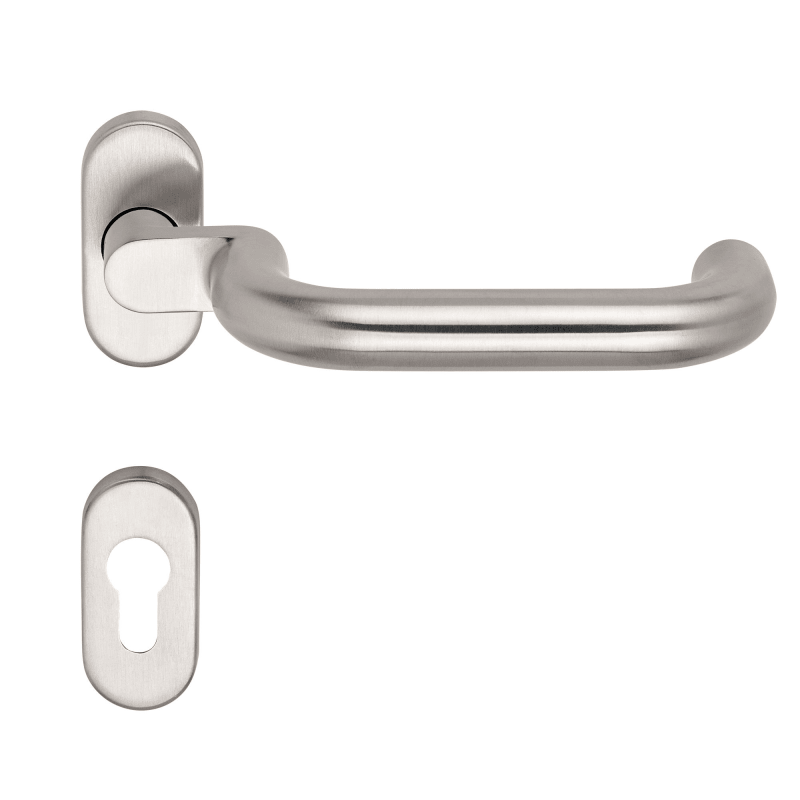 BKS Drücker-Halbgarnitur RONDO B-70130; Material: Edelstahl; Befestigungsart: verdeckt verschraubt; Befestigungstechnik: ohne Stütznocken; Abdeckung: mit Rosetten; Form: oval; Benutzerklasse: Klasse 4