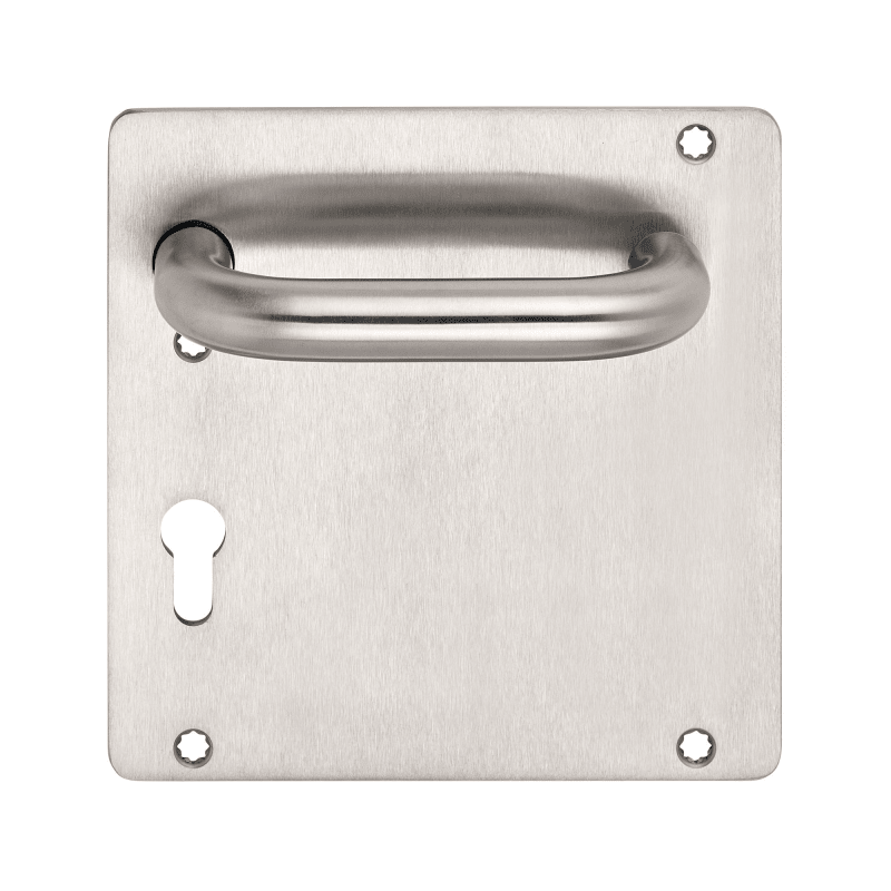 BKS Drücker-Halbgarnitur RONDO B-70150; Material: Edelstahl; Befestigungsart: sichtbar verschraubt; Befestigungstechnik: ohne Stütznocken; Vierkant: 8 mm; Abdeckung: Breitschild; Form: eckig; Einsatzbereich: Objekttür; Basis: Drücker-Halbgarnitur; Lochung: Profilzylinder gelocht; Entfernung: 72 mm; Befestigungssystem: Stiftverbindung; Türstärke min.: 37 mm; Türstärke max.: 42 mm; Drückerbefestigung: Vierkantstift; Schildstärke: 9 mm; DIN-Richtung: DIN Rechts; Lagerung: festdrehbar; Breite: 180 mm; Länge: 180 mm; Oberfläche: matt gebürstet; Farbton: edelstahl; Türart: Abschlusstüren; Anschlagrichtung: Drücker rechts zeigend; Türwerkstoff: Holz,Stahl; Drückerhöhe: 70 mm; Drückerlänge: 145 mm; Ausführung: mit Drücker H1.0; Drückerform: U-Form