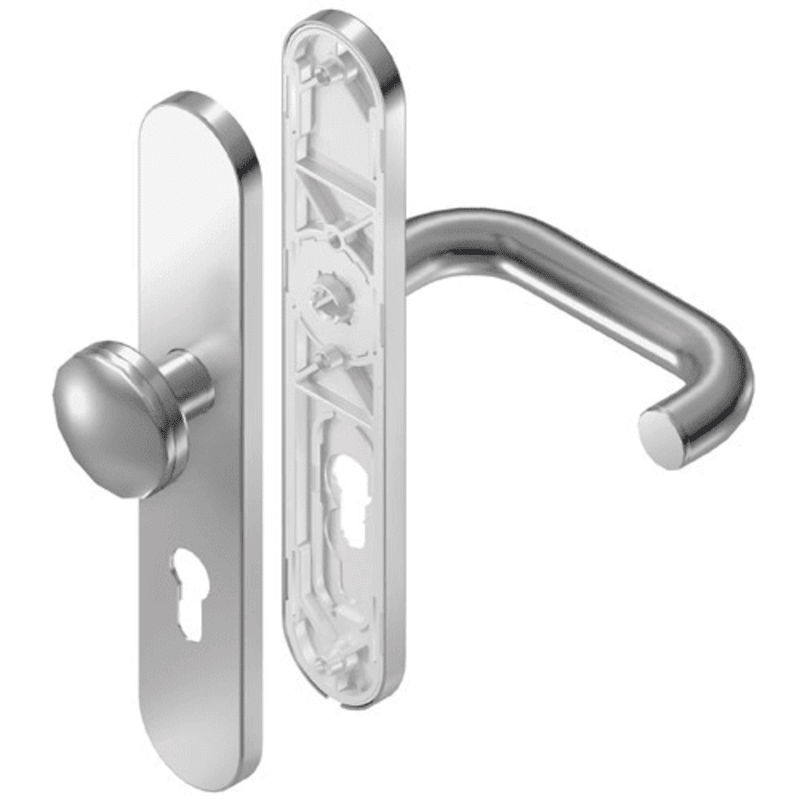 BKS Wechselgarnitur RONDO B-70220; Material: Aluminium; Befestigungsart: verdeckt verschraubt; Befestigungstechnik: mit Stütznocken; Vierkant: 8 mm; Befestigungssystem: Stiftverbindung; Abdeckung: Langschild; Lagerung: wartungsfrei,festdrehbar; Form: oval; Benutzerklasse: Klasse 4; Einsatzbereich: Objekttür; Basis: Wechselgarnitur; Lochung: Profilzylinder gelocht; Entfernung: 72 mm; Türstärke min.: 37 mm; Türstärke max.: 42 mm; Knopfhöhe: 57 mm; Knopfform: rund; DIN-Richtung: DIN Links-Rechts; Norm: DIN EN 1906; Eigenschaft: Knopf fest auf Schild; Drückerdurchmesser: 21 mm; Breite: 45 mm; Länge: 252 mm; Oberfläche: lackiert; Farbton: naturfarbig; Türart: Abschlusstüren; Drückerbefestigung: Wechselstift; Anschlagrichtung: Drücker rechts/links verwendbar; Knopfdurchmesser: 50 mm; Türwerkstoff: Holz,Stahl; Drückerhöhe: 70 mm; Drückerlänge: 145 mm; Ausführung: mit Drücker H1.0,mit Rundknopf K1.0; Schildstärke außen: 9 mm; Schildstärke innen: 9 mm; Drückerform: U-Form