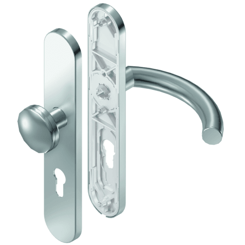 BKS Wechselgarnitur OFFICE B-70220; Material: Edelstahl; Befestigungsart: verdeckt verschraubt; Befestigungstechnik: mit Stütznocken; Vierkant: 8 mm; Befestigungssystem: Stiftverbindung; Abdeckung: Langschild; Lagerung: festdrehbar,wartungsfrei; Form: oval; Benutzerklasse: Klasse 4; Einsatzbereich: Objekttür; Basis: Wechselgarnitur; Lochung: Profilzylinder gelocht; Entfernung: 72 mm; Türstärke min.: 37 mm; Türstärke max.: 42 mm; Knopfhöhe: 57 mm; Knopfform: rund; DIN-Richtung: DIN Links-Rechts; Norm: DIN EN 1906; Eigenschaft: Knopf fest auf Schild; Drückerdurchmesser: 21 mm; Breite: 45 mm; Länge: 252 mm; Oberfläche: matt gebürstet; Farbton: edelstahl; Türart: Abschlusstüren; Drückerbefestigung: Wechselstift; Anschlagrichtung: Drücker rechts/links verwendbar; Knopfdurchmesser: 50 mm; Türwerkstoff: Holz,Stahl; Drückerhöhe: 70 mm; Drückerlänge: 150 mm; Ausführung: mit Drücker H4.0,mit Rundknopf K1.0; Schildstärke außen: 9 mm; Schildstärke innen: 9 mm; Drückerform: Gehrung,gebogen