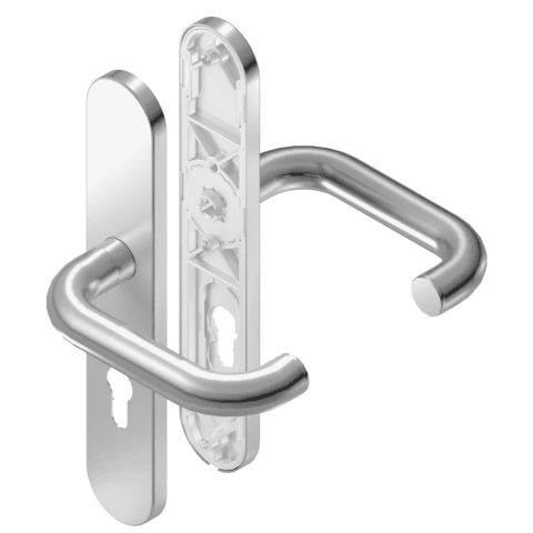 BKS Drückergarnitur RONDO B-72020; Material: Aluminium; Befestigungsart: verdeckt verschraubt; Befestigungstechnik: mit Stütznocken; Vierkant: 9 mm; Abdeckung: Langschild; Form: oval; Benutzerklasse: