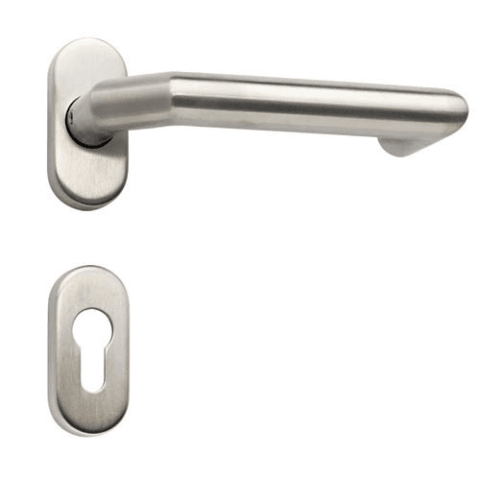 BKS Drückergarnitur BELCANTO-PANIK B-72030; Abdeckung: mit Rosetten; Form: oval; Vierkant: 9 mm; Material: Aluminium; Befestigungsart: verdeckt verschraubt; Befestigungstechnik: ohne Stütznocken; Benu