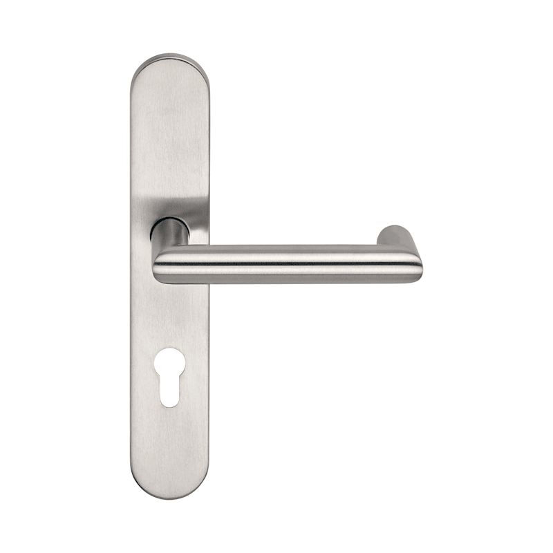 BKS Drücker-Halbgarnitur BELCANTO-PANIK B-72120; Material: Edelstahl; Befestigungsart: verdeckt verschraubt; Befestigungstechnik: mit Stütznocken; Vierkant: 9 mm; Abdeckung: Langschild; Form: oval; Benutzerklasse: Klasse 4; Einsatzbereich: Feuerhemmend; Basis: Drücker-Halbgarnitur; Lochung: Profilzylinder gelocht; Entfernung: 92 mm; Befestigungssystem: Stiftverbindung; Länge: 252 mm; Türstärke min.: 42 mm; Türstärke max.: 52 mm; Lagerung: festdrehbar,wartungsfrei; Schildstärke: 9 mm; Norm: DIN EN 179,DIN 18273,DIN EN 1906; DIN-Richtung: DIN Links-Rechts; Zulassung: für Rauchschutz,für Feuerschutz,für Notausgänge; Breite: 45 mm; Oberfläche: matt gebürstet; Farbton: edelstahl; Türart: Fluchttüren; Drückerbefestigung: Vierkantstift; Anschlagrichtung: Drücker rechts/links verwendbar; Türwerkstoff: Holz,Stahl; Drückerhöhe: 70 mm; Drückerlänge: 145 mm; Ausführung: mit Drücker H3.0; Drückerform: Gehrung,U-Form; Drückerdurchmesser: 21 mm
