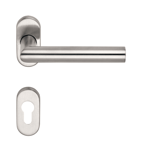 BKS Drücker-Halbgarnitur BELCANTO B-72130; Material: Edelstahl; Befestigungsart: verdeckt verschraubt; Befestigungstechnik: ohne Stütznocken; Abdeckung: mit Rosetten; Form: oval; Benutzerklasse: Klass