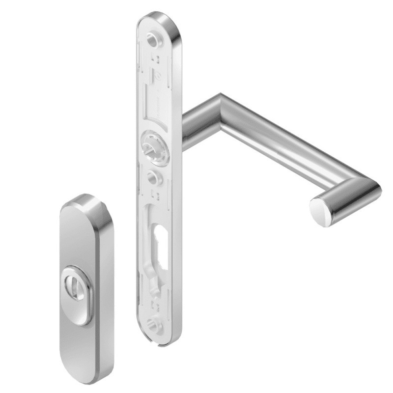 BKS Schutz-Drückergarnitur BELCANTO-PANIK B-75070; Abdeckung: Langschild; Widerstandsklasse: ES 1 (SK2); Form: oval; Vierkant: 9 mm; Material: Edelstahl; Lagerung: festdrehbar,wartungsfrei; Befestigun