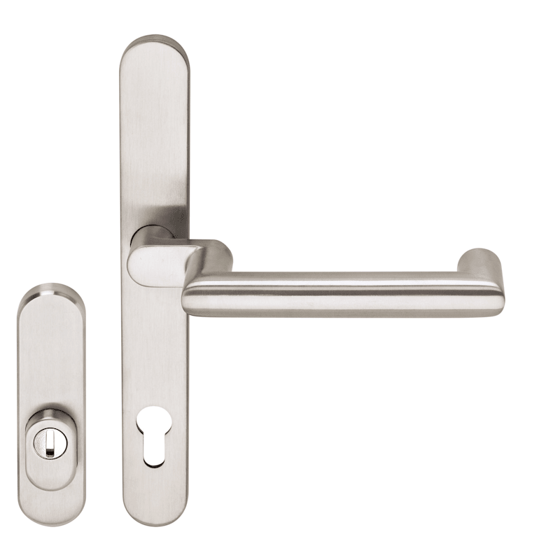 BKS Schutz-Drückergarnitur BELCANTO-PANIK B-75070; Abdeckung: Langschild; Widerstandsklasse: ES 1 (SK2); Form: oval; Vierkant: 9 mm; Material: Edelstahl; Lagerung: festdrehbar,wartungsfrei; Befestigungstechnik: mit Stütznocken; Befestigungsart: verdeckt verschraubt; Benutzerklasse: Klasse 4; Basis: Schutz-Drückergarnitur; Ausführung: mit Zylinderabdeckung,mit Drücker H3.2; Lochung: Profilzylinder gelocht; Entfernung: 92 mm; DIN-Richtung: DIN Links-Rechts; Anschlagrichtung: Drücker rechts/links verwendbar; Farbton: edelstahl; Oberfläche: matt gebürstet; Türstärke min.: 54 mm; Türstärke max.: 69 mm; Befestigungssystem: Stiftverbindung; Drückerbefestigung: Vierkantstift; Drückerform: versetzt,Gehrung,U-Form; Drückerhöhe: 80 mm; Drückerlänge: 173 mm; Drückerdurchmesser: 21 mm; Schildbreite innen: 32,7 mm; Schildlänge innen: 252 mm; Schildstärke innen: 9 mm; Schildbreite außen: 36 mm; Schildlänge außen: 137,5 mm; Schildstärke außen: 15 mm; Einsatzbereich: Feuerhemmend; Türart: Fluchttüren,Rahmentüren; Türwerkstoff: Aluminium,Stahl; Norm: DIN 18257,DIN EN 179,DIN 18273,DIN EN 1906; Zulassung: für Notausgänge,für Feuerschutz,für Rauchschutz