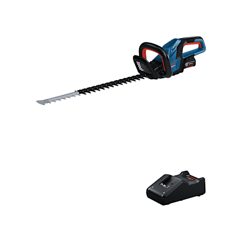 Akku-Heckenschere GHE 18V-60, Die Akku-Heckenschere GHE 18V-60 Professional ist dank ihres ergonomischen Designs leicht in der Handhabung. Der kraftvolle bürstenlose Motor sorgt für einen kontinuierlichen Schnitt bei mitteldichten Hecken. Mit einer Schnittleistung von 20 mm kannst du auch dickere Äste problemlos und bequem schneiden. Beim Trimmen von hartnäckigen Ästen verhindert das patentierte Bosch Anti-Blocking System ein Verklemmen der Schneidemesser, dank elektronischer Erkennung und automatischer Wiederholung des Schnitts. Aufgrund ihres geringen Gewichts, der optimalen Balance und ihres ergonomischen Designs eignet sich die Akku-Heckenschere gut für längere Arbeiten. Dank der geringen Lautstärke und des emissionsfreien Betriebs ist die Akku-Heckenschere ideal für Arbeiten in Wohngebieten oder anderen lärmsensiblen Bereichen geeignet. Kompatibel mit dem Bosch Professional 18V System und mit der markenübergreifenden AMPShare Akku-Allianz. Karton. 1 x Akku GBA 18V 4.0Ah (1 600 Z00 038). Schnellladegerät GAL 18V-40 Professional (2 607 226 251)