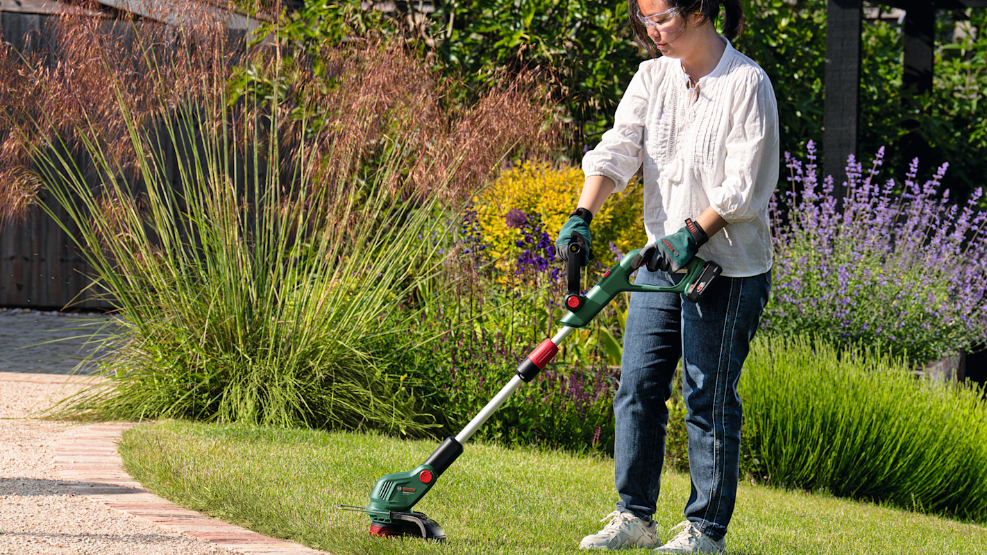 Akku-Rasentrimmer UniversalGrassCut 18V-23-450. Flexibles und bequemes Trimmen. Teleskop-Höhenverstellung für bequeme Handhabung und Körperhaltung. EdgeSimple-Funktion ermöglicht Kantenschneiden durch einfaches Drücken und Drehen des Handgriffs. Schwenkkopf für präzises Trimmen unter Bänken und an schwer erreichbaren Stellen. Dank der unkomplizierten halbautomatischen Spule sind keine manuellen Anpassungen erforderlich. Ideal zum Kantenschneiden, Trimmen und Schneiden von Gras und Unkraut bei kleinen bis mittelgroßen Rasenflächen. Kompatibel mit Bosch 18V POWER FOR ALL-Akku