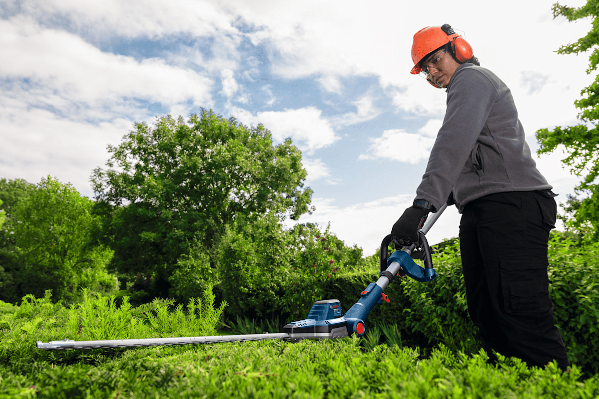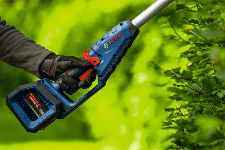 Akku-Stabheckenschere PRO GHE18V-50FP, Die Akku-Stabheckenschere PRO GHE18V-50FP eignet sich ideal für den Schnitt von hohen Hecken, ganz ohne Benzin und lästige Abgase. Diese leistungsstarke Heckenschere kann dank des Auslösers für variable Geschwindigkeiten und des patentierten Bosch Anti-Blockier-Systems dickere und höhere Äste problemlos und ohne Verklemmen schneiden. Mit dem ergonomischen 360°-Zusatzhandgriff lässt sich die Heckenschere einfach manövrieren. Zudem sorgt der Griff dafür, dass das Gerät bequem und sicher in der Hand liegt. Der abgewinkelte Schneidkopf ermöglicht Schnitte aus verschiedenen Winkeln für einen sauberen oberen und seitlichen Abschluss von Hecken. Darüber hinaus wiegt dieses ergonomische Werkzeug nur 4,2 kg (ohne Akku). Es bietet eine optimale Balance, ist leicht zu handhaben und reduziert die Ermüdung bei längeren Einsätzen. Die Akku-Stabheckenschere PRO GHE18V-50FP eignet sich perfekt für den Schnitt von hohen Hecken und von kleineren Sträuchern und Büschen. Dieses Gerät ist robust genug, um dickere Äste und anspruchsvollere Hecken zu bearbeiten. Gleichzeitig ist es auch präzise genug für feinere Schnitte. Es ist kompatibel mit dem Bosch Professional 18V System und der markenübergreifenden AMPShare Akku-Allianz. Die Akku-Teleskopheckenschere PRO GHE18V-50FP lässt sich reibungslos starten und bietet einen geringen Wartungsaufwand und eine lange Lebensdauer. Sie läuft mit 3.400 Hüben pro Minute, hat einen Zahnabstand von 23,5 mm und einen niedrigen Geräuschpegel von 90 dB(A). Sie kommt mit einem hochwertigen 50 cm langen Messer in einem robusten Aluminiumgehäuse. Es entstehen keine Abgase und das Werkzeug lässt sich für den einfachen Transport und die leichte Aufbewahrung in zwei Teile zerlegen. Karton