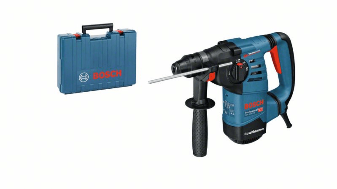 Bohrhammer mit SDS plus GBH 3-28 DRE, Der GBH 3-28 DFR Professional hat die vielseitigste Leistung im SDS plus Segment kabelgebundener Bohrhammer. Das kompakte Gehäuse ermöglicht vielfältige Anwendungen bei begrenzten Platzverhältnissen. Die L-förmige Bauweise sorgt für eine ausgewogene Gewichtsverteilung und Vibration Control für ein müheloses andauerndes Arbeiten. Dank seinem 800-Watt-Motor und einem Werkzeuggewicht von nur 3,6 kg verfügt er über ein hohes Verhältnis zwischen Leistung und Gewicht. Dieses Elektrowerkzeug eignet sich zum Bohren und Meißeln in Beton, Mauerwerk, Holz und Metall. Es ist kompatibel mit verschiedenen Systemzubehören zur Staubabsaugung. Ferner verfügt der GBH 3-28 DFR Professional über ein Schnellspannbohrfutter für Rundschaftbohrer, ein Wechselfutter (SDS plus), Rechts-/Links-Lauf, eine Überlastkupplung, variable Drehzahl und Vario-Lock. Zusatzhandgriff (2 602 025 191); Handwerkerkoffer (2 605 438 651); Tiefenanschlag 210 mm (1 613 001 010); Fetttube (ET-Nr. 1 615 430 010); Maschinentuch