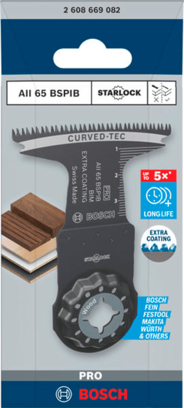 Herausragende Lebensdauer in Hartholz und abrasiven Holzwerkstoffen! Bi-Metall Blatt: Kombiniert harte Zähne mit flexiblem Blattkörper Als ideale Problemlösung für Profis kombiniert das PRO AII 65 BSPIB eine hervorragende Fähigkeit für Tauchschnitte mit einer Zähigkeit, die sicherstellt, dass auch Hartholz und Holzverbundwerkstoffe bearbeitet werden können. Das PRO AII 65 BSPIB Tauchsägeblatt besteht aus BI-Metall für Stärke und Ausdauer. Der Besatz mit japanischen Zähnen machen es besonders langlebig und ermöglichen aggressive und schnelle Schnitte in Hartholz mit weniger Hitzespuren. Durch das Curved-Tec-Design ist die Klinge ideal für ausrissfreie Tauchschnitte.
