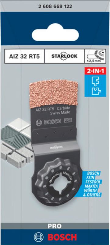Mehr Funktionalität beim Ersetzen von Fliesen! Duales Design für maximale Effizienz Wenn es darum geht, kaputte Fliesen zu entfernen, ist das Multifunktionswerkzeug sehr effektiv. Profis benötigten jedoch trotzdem 2 Blätter. Dank seines cleveren Designs erreichst du mit dem PRO AIZ 32 RT5 die Fugen um kleine Fliesen herum und kannst den alten Mörtel dahinter sauber abschleifen. Das PRO AIZ 32 RT5 Tauchsägeblatt nutzt ein duales Design von Bosch für maximale Effizienz: Es erledigt die Arbeit von zwei Standardblättern. Darüber hinaus ist es dank des robusten Carbide-Korns effektiv bei der Arbeit mit abrasiven Materialien.