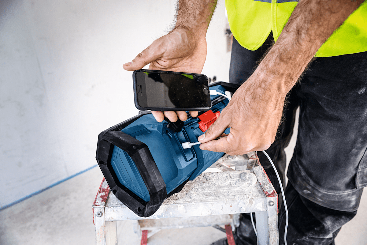 Radio GPB18V-3C, Das PRO GPB18V-3C erfüllt deinen Arbeitsplatz mit Musik und Klang über FM, Bluetooth® und Multi-Speaker Sound, mit dem du Musikstreams auf mehreren kompatiblen Geräten über Bluetooth teilen und verbinden kannst. Es ist einfach zu bedienen, bietet Aufladen über USB-C® und Schutzart IP54, wenn die Akkuabdeckung und alle Fächer geschlossen sind. Dieses kompakte Radio ist senkrecht oder waagerecht aufstellbar und verfügt sowohl über einen Griff als auch einen Haken für einfachen Transport und praktische Aufbewahrung. Kompatibel mit dem Bosch Professional 18V System und dem markenübergreifenden Akkusystem AMPShare. Das Radio kann mit einem USB-C®-Netzteil mit Power Delivery (PD) betrieben werden. Karton